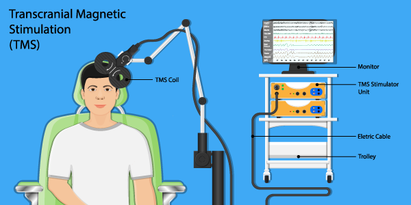 เป็นเครื่องกระตุ้นสมองด้วยคลื่นแม่เหล็ก เมื่อกระแสไฟฟ้าถูกส่งผ่านเข้าไปในขดลวด (TMS coil) จะเหนี่ยวนำทำให้เกิดสนามแม่เหล็กตามหลักการของฟาราเดย์ (Faraday) เมื่อสนามแม่เหล็กถูกทาบลงบนศีรษะ เซลล์ประสาทที่เปรียบเสมือนขดลวดอีกอันหนึ่งจะเหนี่ยวนำทำให้เกิดกระแสไฟฟ้าไหลเวียนภายในเปลือกสมองโดยที่ไม่ต้องใช้กระแสไฟฟ้ากระตุ้นสมองโดยตรง